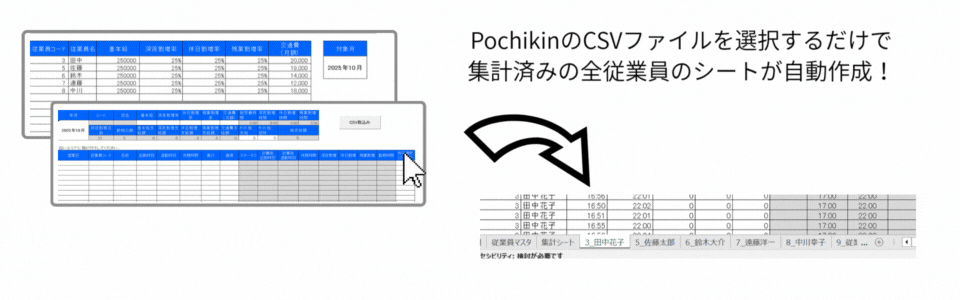 ポチ勤(Pochikin)のデータを貼付けると給与計算が簡単にできます。